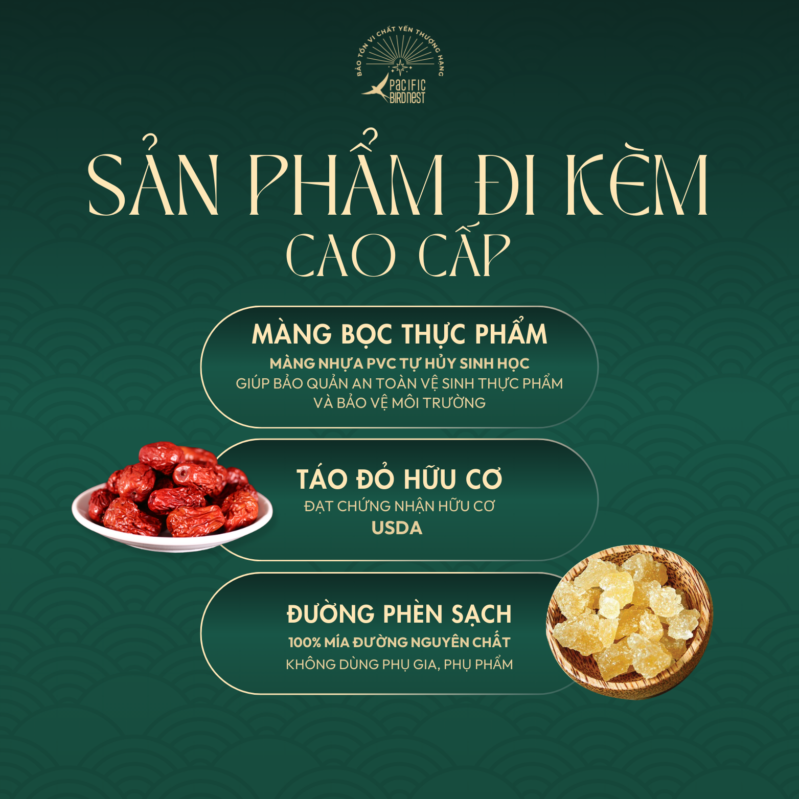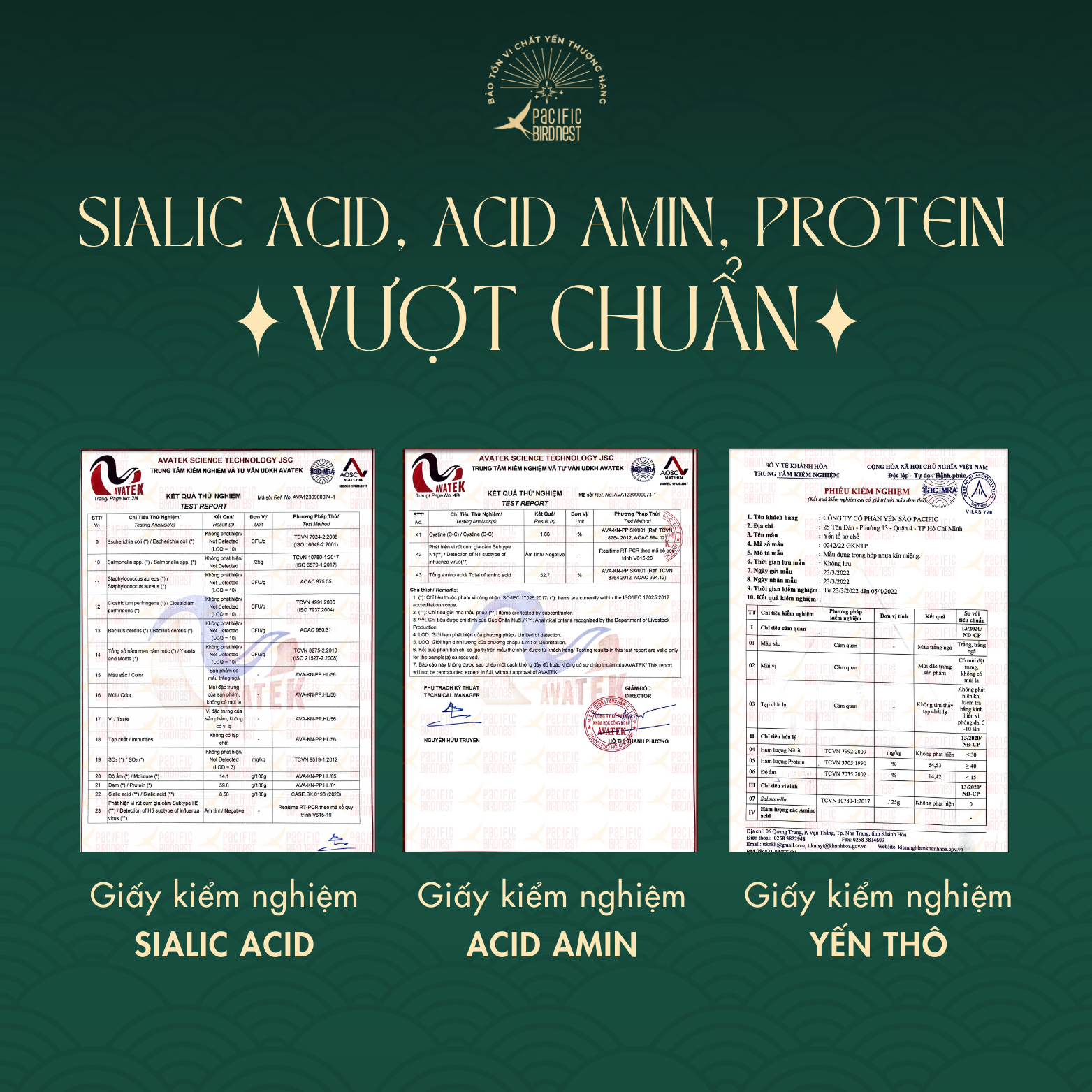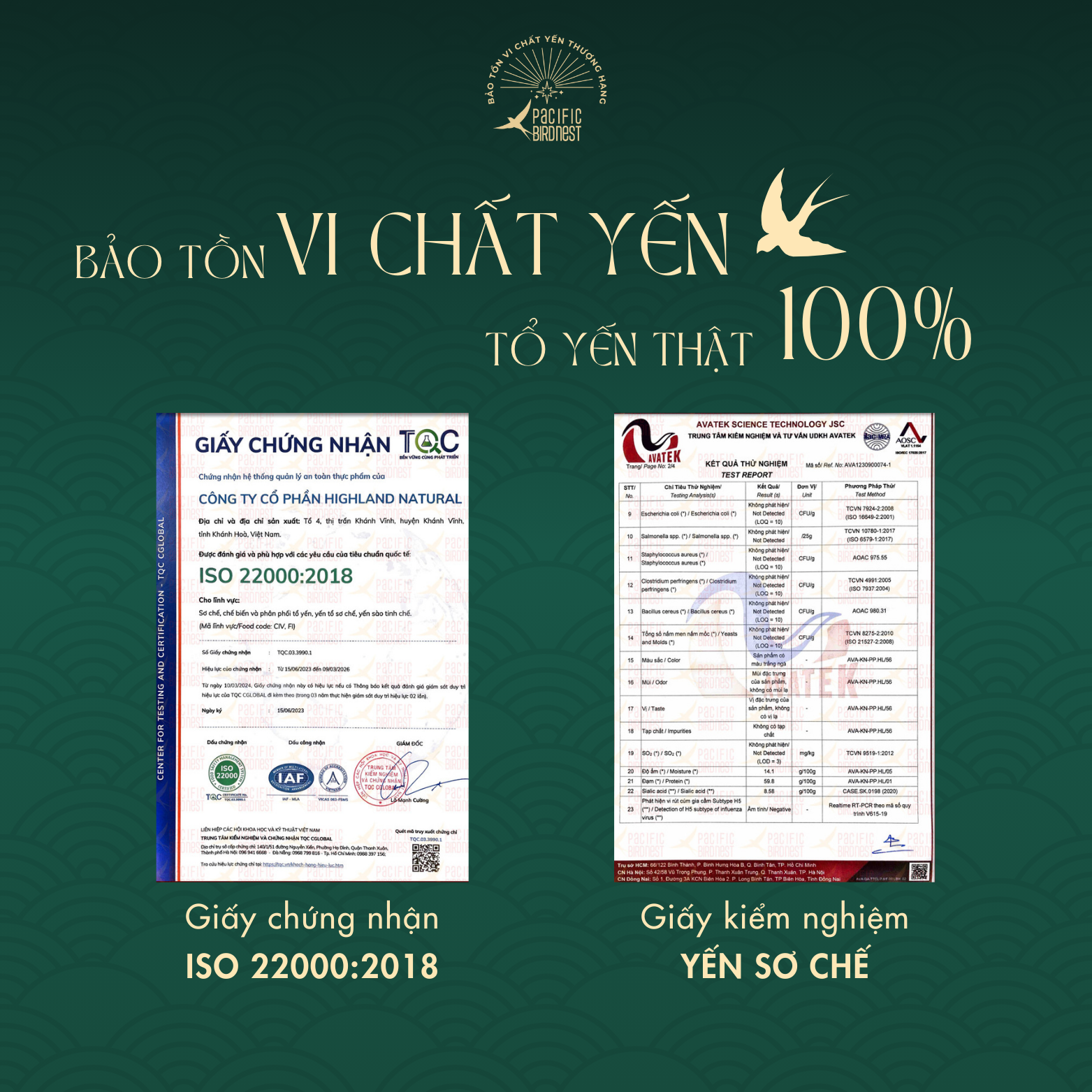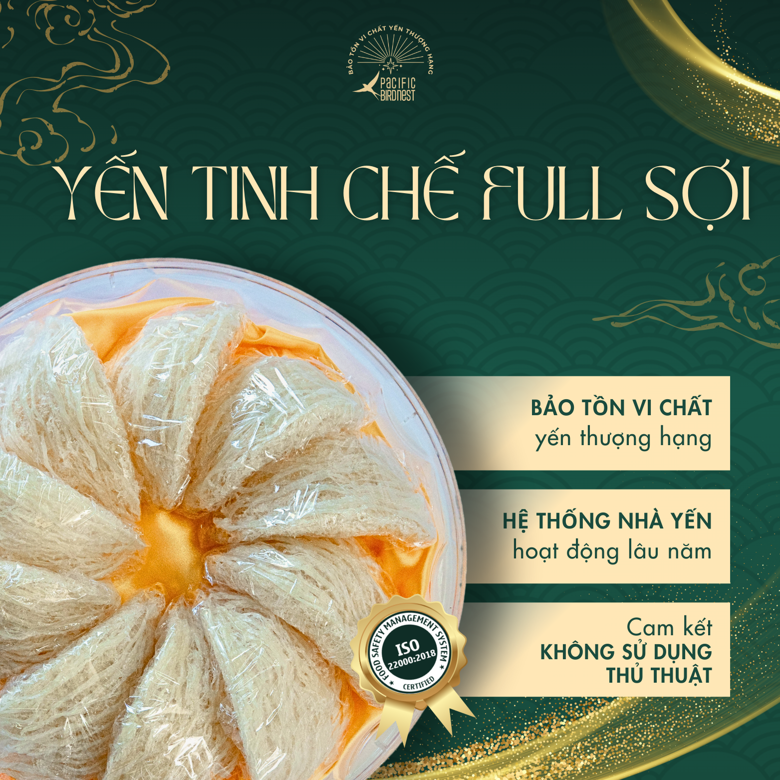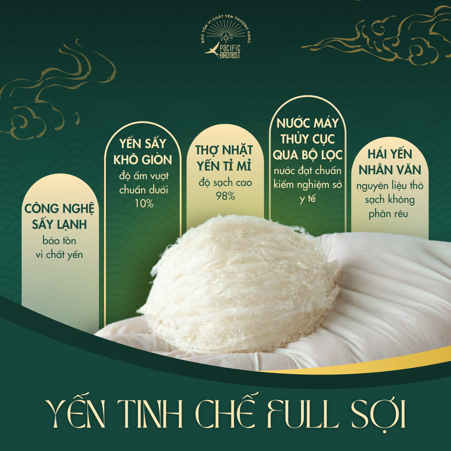 Lựa chọn nguyên liệu thô đầu vào sạch, không phân rêu, trực tiếp từ nhà yến lâu năm. Yến được sơ chế làm sạch bằng phương pháp nhặt ướt dưới dòng nước chảy liên tục, đảm bảo độ sạch lên đến 99% và bảo tồn vi chất yến tốt nhất. Sau đó, yến được chọn lựa những sợi dài, không bị đứt gãy và định hình vào khuôn trước khi sấy lạnh đến độ ẩm vượt chuẩn. Kiểm nghiệm chỉ tiêu chất dinh dưỡng trong yến tinh chế Pacific Bird Nest vượt chuẩn Nghị định của Chính phủ.