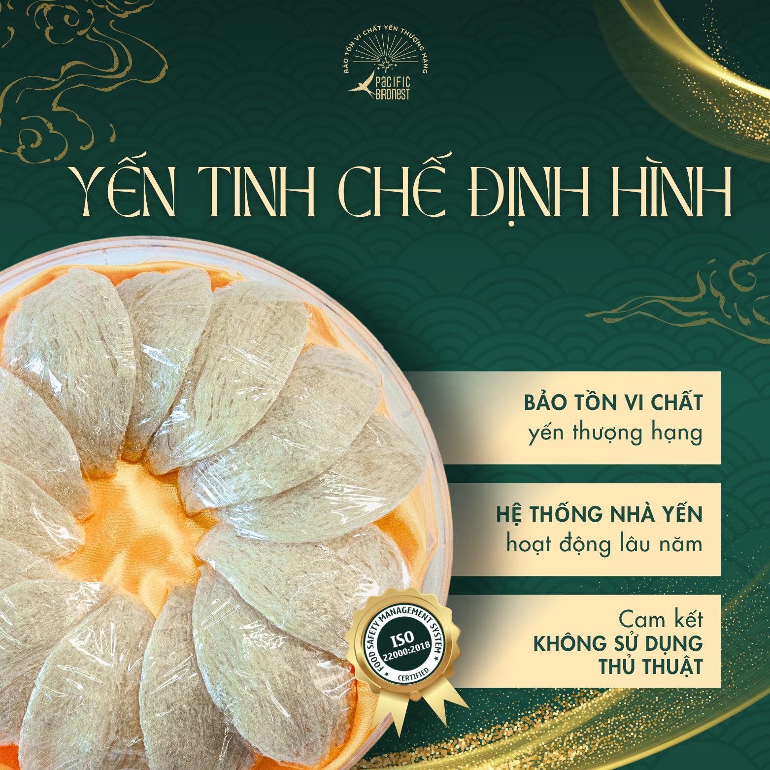 Lựa chọn nguyên liệu thô đầu vào sạch, không phân rêu, trực tiếp từ nhà yến lâu năm. Sau khi được sơ chế bằng phương pháp nhặt ướt, dưới dòng nước chảy liên tục, đảm bảo độ sạch lên đến 99% và bảo tồn vi chất yến tốt nhất. Yến sẽ được đóng định hình chuẩn dáng và được sấy lạnh đến độ ẩm vượt chuẩn. Yến thành phẩm đạt tỉ lệ 2,5:1. Kiểm nghiệm chỉ tiêu chất dinh dưỡng trong yến tinh chế Pacific Bird Nest vượt chuẩn Nghị định của Chính phủ.